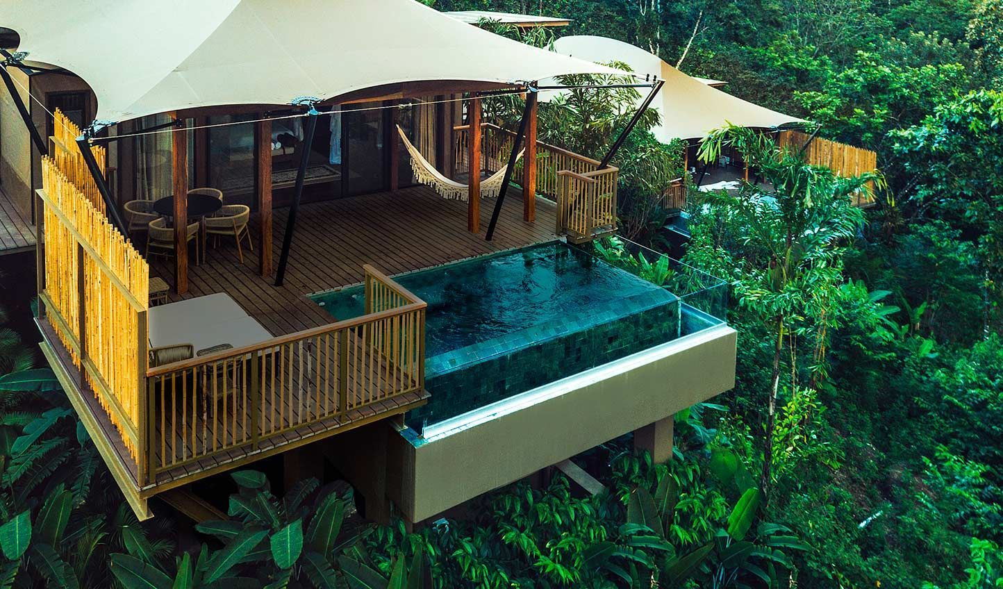 Each tent is perched on a platform high above the ground, with private plunge pools and outdoor showers that offer stunning views of the surrounding jungle and the majestic Arenal Volcano. The interiors are lavishly appointed with plush furnishings, ensuring that guests enjoy the utmost comfort while being close to nature.